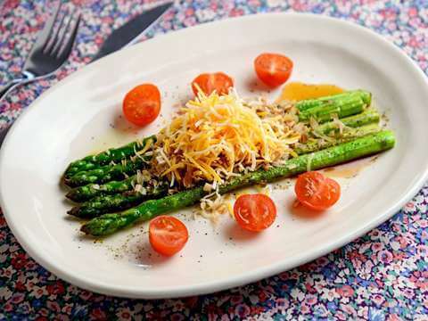 人気の春野菜アスパラガスを使った、ささっと作れるおしゃれな一品。オリーブオイル×「ヤマサ昆布ぽん酢」でソテーし、仕上げにおかかとチーズたっぷりと。おもてなしにもおすすめです♪