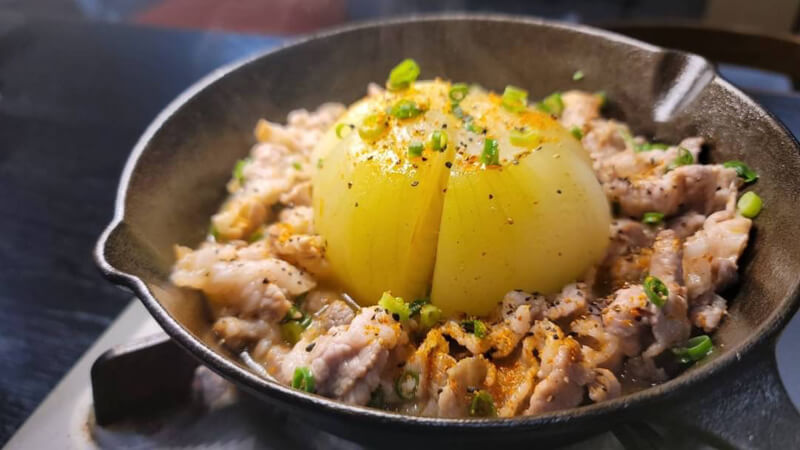 玉ねぎを丸ごと一個使っちゃう、ダイナミックな料理!丸ごと玉ねぎの甘味とジューシー感、豚肉の旨味、そして「ヤマサ ぱぱっとちゃんと これ!うま!!つゆ」の出汁感がベストマッチ!!
