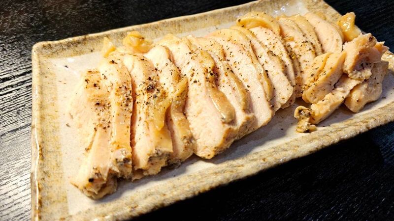 「ヤマサ ぱぱっとちゃんと これ!うま!!つゆ」と鶏がらスープの素を入れることで、ダブルのだしが鶏むね肉にしみて、美味しいサラダチキン!湯煎で作ることで、しっとり美味しく仕上がります。