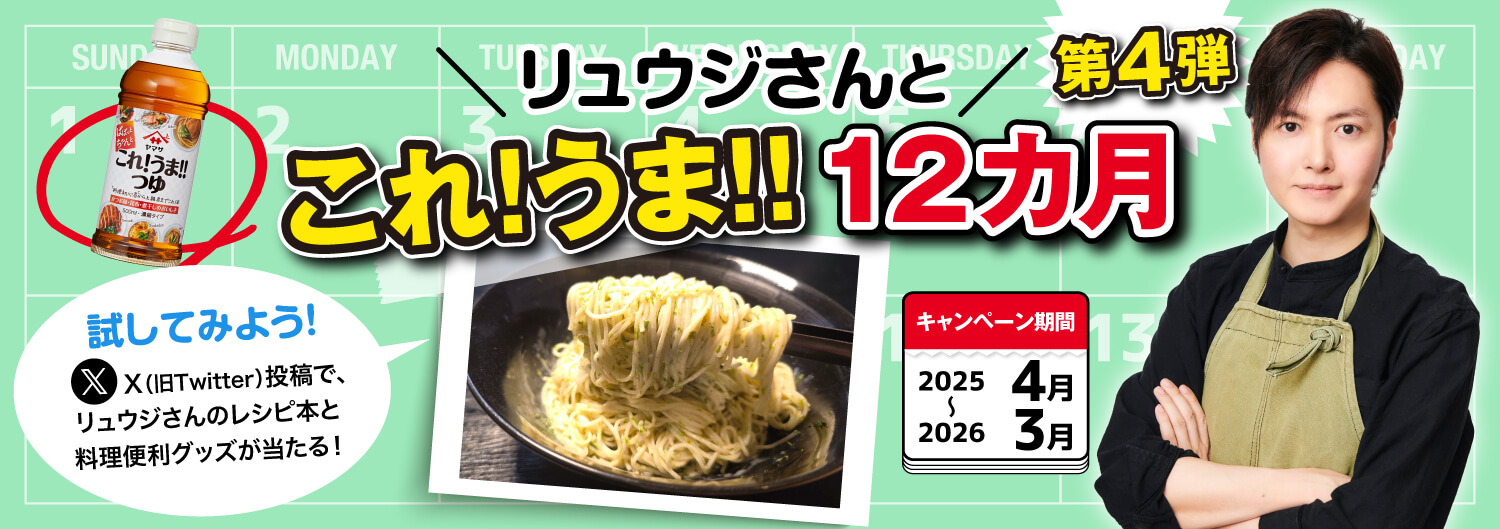 10月の「リュウジさんとこれ!うま!!12ヶ月 第4弾」のレシピを作っていただき、X(旧Twitter)で料理画像とコメントをハッシュタグ「#リュウジこれうま10月」をつけて投稿いただき、ヤマサ醤油公式X(旧Twitter)アカウント @uwasanoyamasan のフォローをお願いします。