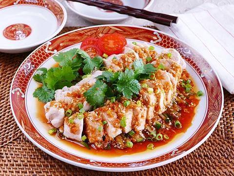 「ヤマサ鮮度生活 特選丸大豆しょうゆ」をベースに、風味豊かに仕上げた中華だれをたっぷりかけて作る、人気の「よだれ鶏」。鶏むね肉を片栗粉でコーティングすることで、しっとりジューシーにゆで上がり、旨味も抜けません。