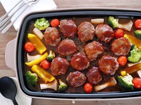家族みんなで囲んで食べられる、ホットプレートで作る煮込みハンバーグ。デミグラスソースに「ヤマサ鮮度生活 特選丸大豆しょうゆ」を加えることで、ケチャップなどの酸味をやわらげて深みを出し、子供から大人まで食べやすい味わいに。