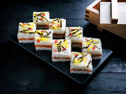 サーモンを「ヤマサ鮮度生活 特選丸大豆しょうゆ」で漬けにし寿司飯で挟み、上にはかぶの千枚漬け・柚子や昆布などを敷き詰めた、おもてなし心伝わる押し寿司。