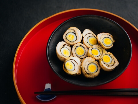2024年の干支「辰」にちなんで、こちらのレシピはいかがでしょう。縁起の良い「竜眼」に見立てたうずらの卵を鶏のささみで巻いた、ほんのりハーブ香る和DEミックスな一品。