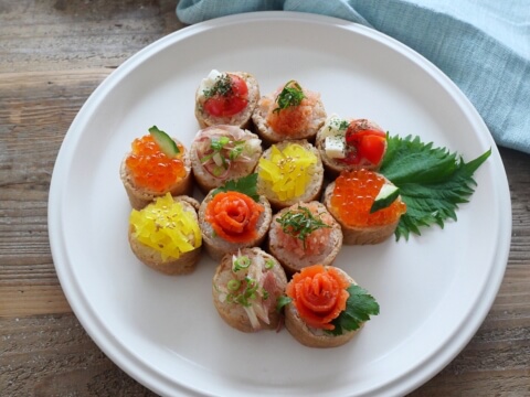 好きな具材をのせてみんなでつまめる、ひとくちいなり。お子さんと一緒にトッピングしても楽しいですよ♪
