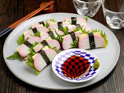 ラストは火を使わない簡単レシピ♪かまぼこやしそ、のりなどの和素材にチーズを合わせ、わさびしょうゆでいただく和DEミックスなおつまみです。