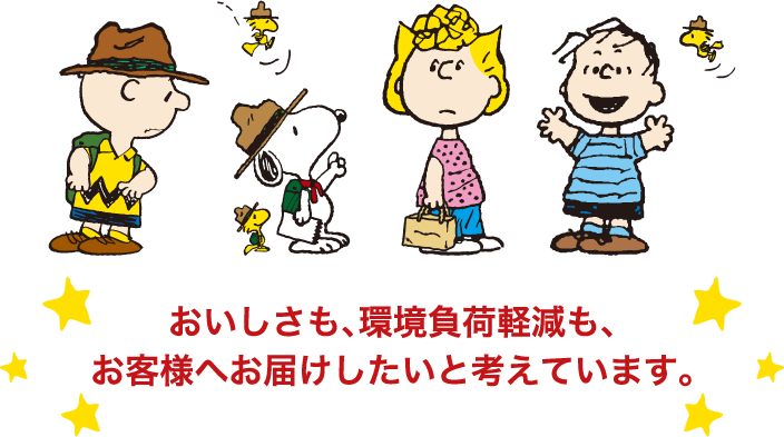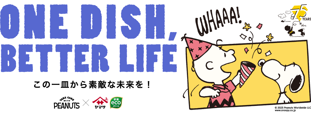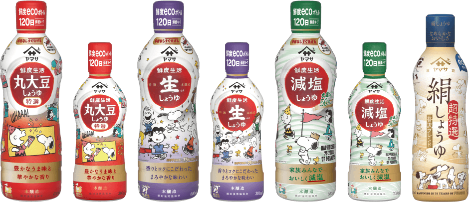 このプロジェクトの「TAKE CARE OF THE EARTH」(地球への思いやり)における、「身の周りにある自然を全身で感じ、環境に負担をかけにくい方法を選び、地球のことをいつくしみましょう」というメッセージに賛同し、私たちヤマサ醤油はPEANUTSとの共同プロジェクトを実施しております。