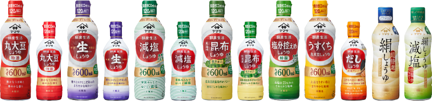ちょっと大きなたっぷりサイズ600mlとちょっと小ぶりな程よいサイズ300ml、絹しょうゆシリーズ450mlの充実ラインナップ。