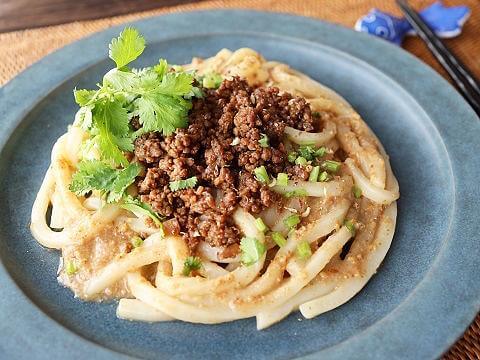 甜麺醤で味付けした肉味噌をうどんにトッピングした、担々麺ならぬ「坦々うどん」。うどんのタレは、「ヤマサごまだれ専科」にすりごまを加え、さらにごま感アップ!ほどよい辛味が後ひくおいしさです。