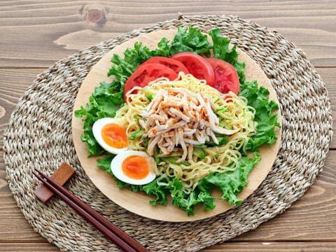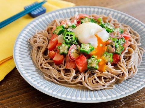 味付けは「ヤマサごまだれ専科」1本にお任せ!夏野菜たっぷりのサラダそば、ヘルシーなランチにもおすすめです。