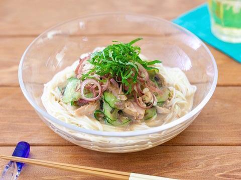 さば味噌煮缶と「ヤマサごまだれ専科」で、手軽に冷や汁風の味わいに。薬味をたっぷりかけるのがおすすめ。そうめんの他、うどんでもおいしく作れます。
