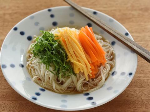 ■せん切りにんじんと青じそ、錦糸卵のぶっかけそうめん