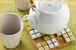 市販のコルクコースターに小さめのタイルを貼ってミニ鍋しき。