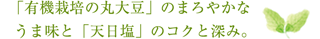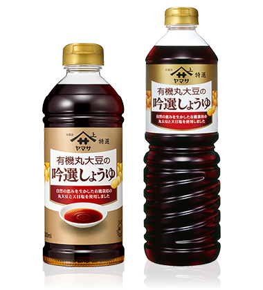 有機栽培で育った丸大豆を原料に、ヤマサの伝統の技でじっくりとつくり上げました。 有機栽培の丸大豆のたんぱく質が、しょうゆ独特の複雑なうま味を醸し出し、 丸大豆に含まれる油脂分が、やさしいまろやかさを生み出します。 もちろん有機栽培の丸大豆は、遺伝子組換え大豆ではありません。