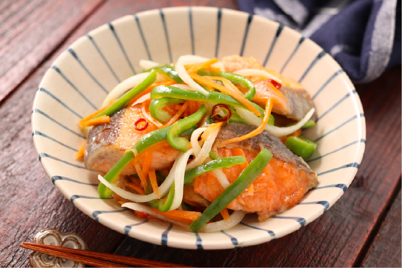 味わいだけでなく「おまかせ酢」はやさしいとろみがあり、食材に絡みやすいのも特徴。「鮭とたっぷり野菜の南蛮漬け」は、鮭と野菜を焼いて「おまかせ酢」1本で漬け込むだけの時短おかず。本来なら漬け込み時間がある程度かかるところ、「おまかせ酢」のトロみを上手に活かすことで漬け込み時間が短く済みます。