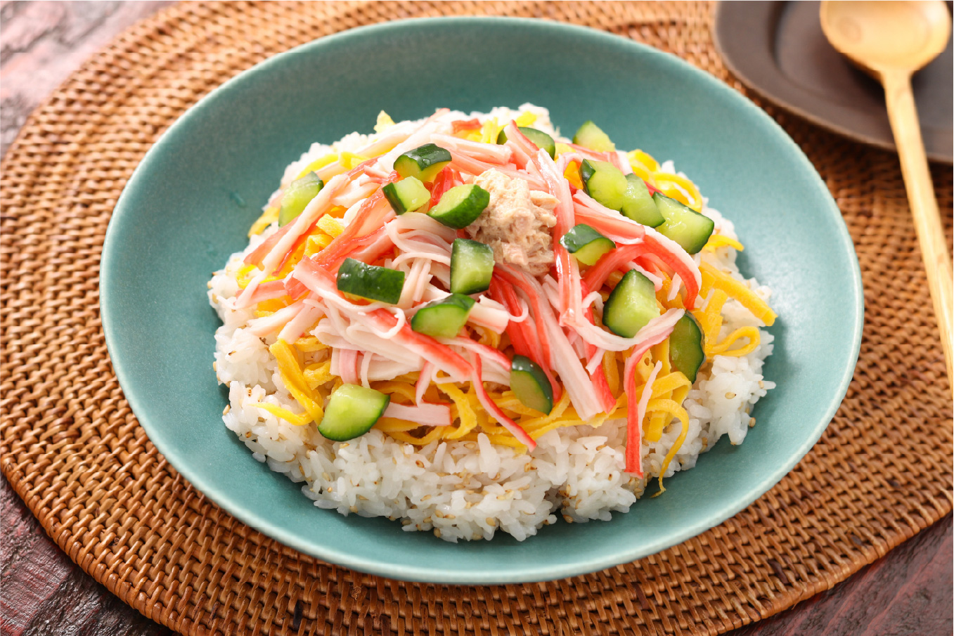 また、「おまかせ酢」でぜひ試していただきたいのが酢飯。通常酢飯の味付けはお酢・砂糖・塩が基本ですが、「おまかせ酢」なら1本でOK。昆布の旨味とやわらかな酸味で、お店のような酢飯が簡単に作れます。とろみがあるので米一粒一粒に「おまかせ酢」がきれいに絡み、酢飯がシャバシャバにならず仕上がります。「サラダちらし」は“おまかせ”酢飯にカラフルな具材を乗せただけ。調理時間10分程で華やかな1品が完成します。